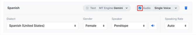 - Gender - Select between the use of a male or a female voice for your Audio Dubs
