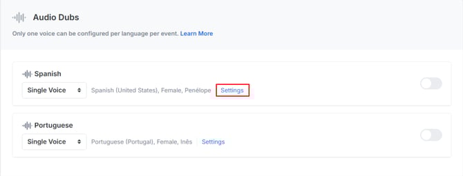 In this article, you will learn how to enable and configure live Audio Dubs for your events using Single, Dynamic or Cloned voices.