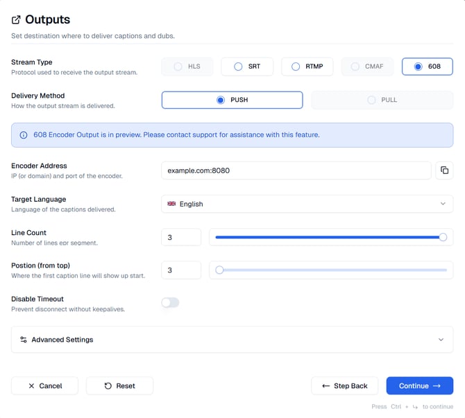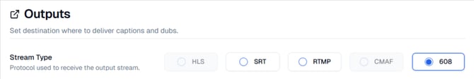 IMPORTANT: 608 Encoder Output is currently in preview. Please contact support for assistance with this feature.