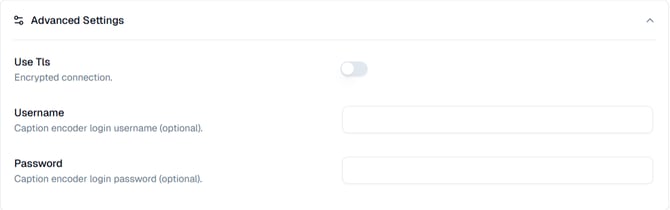 To access the Advanced Settings, click the Advanced Settings dropdown on the page. This section provides optional configuration parameters for authentication and secure connection to your caption encoder.