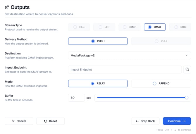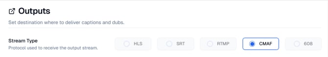 Use this option when SyncWords will push the output stream with processed captions, subtitles, and dubbed audio to your specified CMAF destination using the Common Media Application Format (CMAF). This setup is ideal for low-latency streaming workflows and is commonly used with AWS MediaPackage v2 and other modern CMAF ingest platforms.