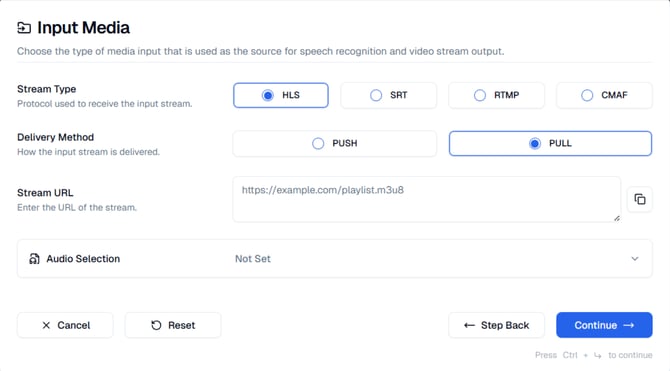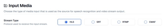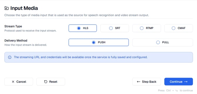 During the Input Media step you can select the type of stream that is used as the source for speech recognition and the video stream output. In this step, you will configure HLS as your input media source. This determines how your live stream is received by the Service for processing. For a list of all steps see our Service Wizard Steps below.