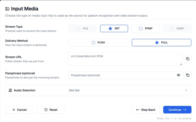 During the Input Media step you can select the type of stream that is used as the source for speech recognition and the video stream output. SRT (Secure Reliable Transport) is a video streaming protocol that provides secure, low-latency streaming over unpredictable networks. In this step, you'll configure SRT as your input source