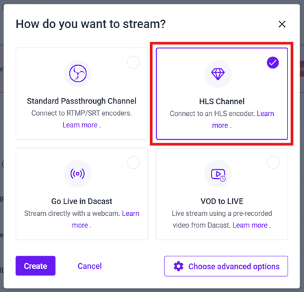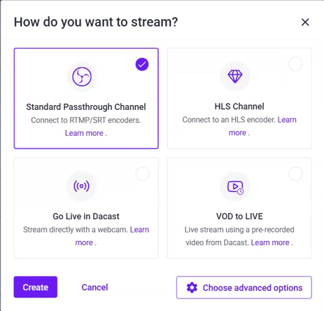 This will open a modal where you can make your selection. Select the "Standard Passthrough Channel" for your RTMP or SRT input stream, and then click on "Create".