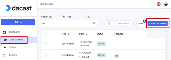 On your Dacast account, click on Live Streams in the left sidebar and then click the "Create Live Stream" button on the right-hand side of the page.