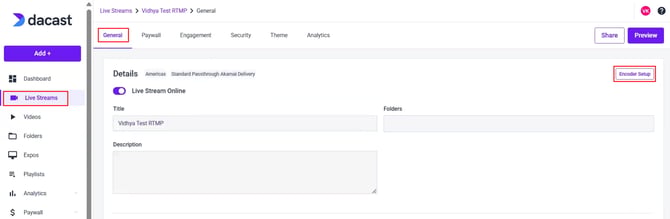 From your RTMP/SRT channel settings, click on the "General" tab. Click on the "Encoder Setup" button near the top right of the page to open a modal