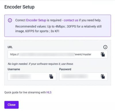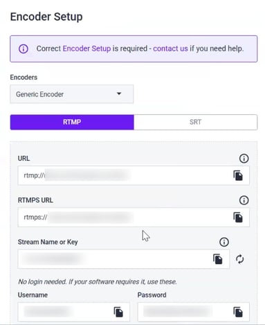 The modal should default to the "Generic Encoder (RTMP or SRT)" setting. Here you will find the URL and Stream Name or Key to enter into your streaming software.