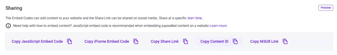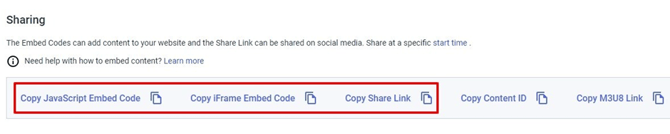 - Copy one of the three embed options: JavaScript embed code, IFrame embed code and Share link which is a directURL with the HLS player.