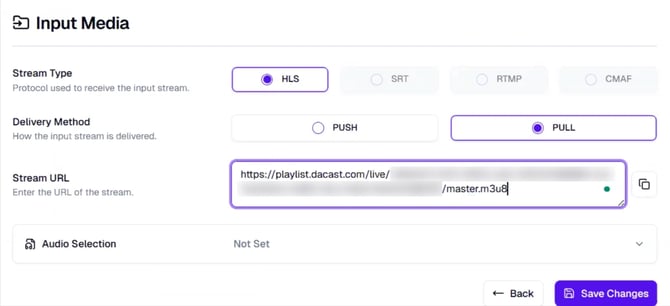 Under Input Media, select HLS Pull from the Stream Type dropdown.