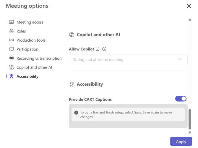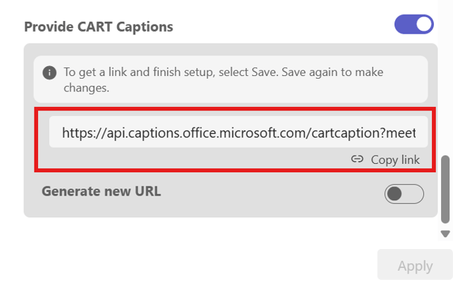 - Under Provide CART Captions, select Copy link to copy the caption link to your clipboard