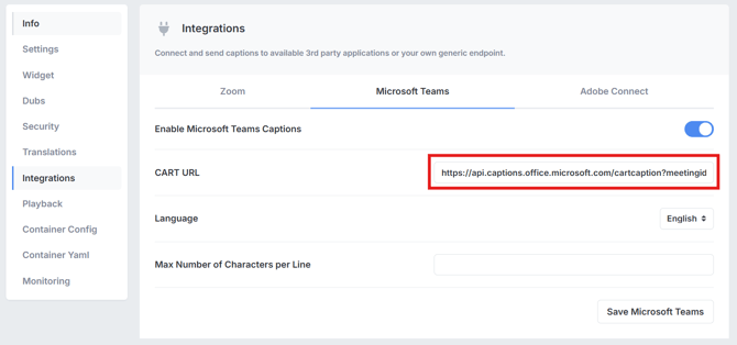 Once you have the CART link from Teams, add it to your SyncWords event: