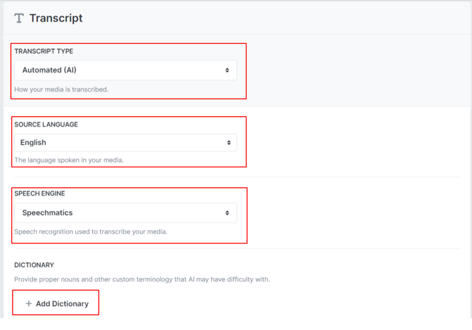 Now that we have set up the incoming stream we need to set up the Transcript section to create the captions. Use the available dropdowns to set the "Source Language" of the event, the "Speech Engine" you would like to use and optionally add or select an existing dictionary.