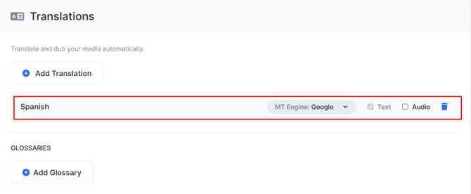 Once you have selected your translation language you can configure it by selecting the translation engine you want to use and optionally add or select an existing glossary.