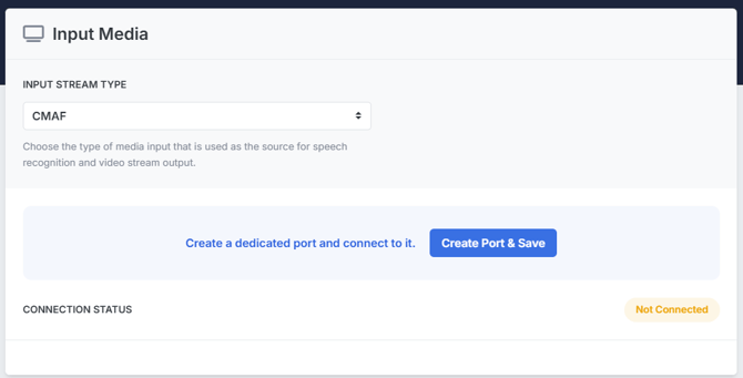 From the "Input Stream Type" drop-down, select CMAF. Then click the "Create Port & Save" button to generate the URL.