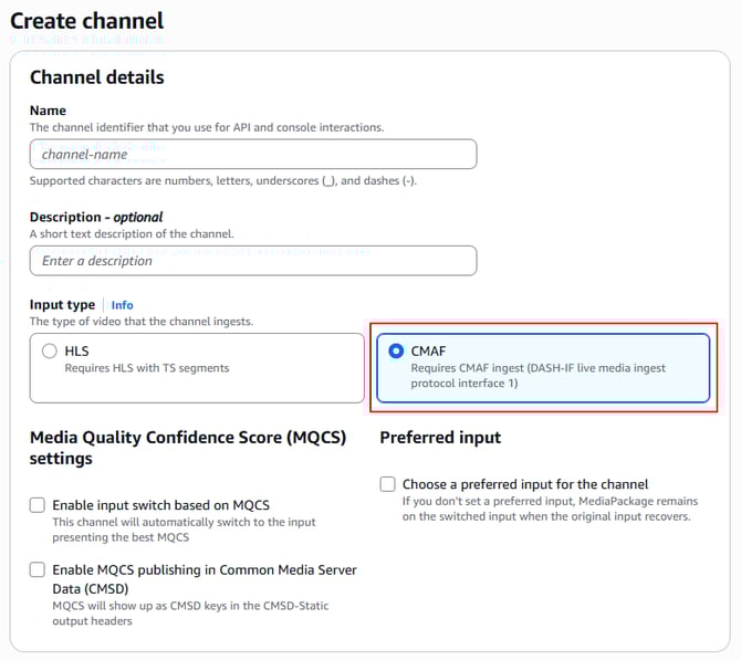 - In MediaPackage v2, create a Channel (or use an existing one) and ensure CMAF is selected as the Input Type