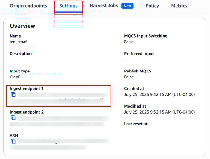 Copy the value generated in the URL (Endpoint) and save it. We will use it when updating our MediaLive settings.