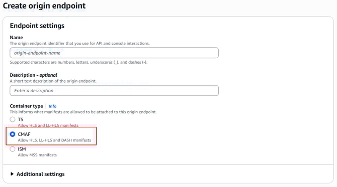 - Create an Origin Endpoint and ensure that the container type is set to CMAF.