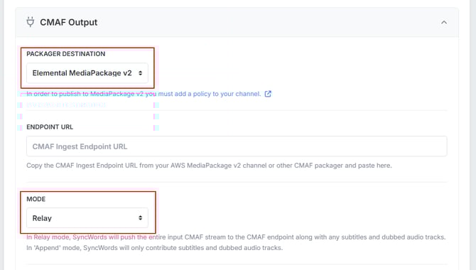 The last step is to set up the stream that will go out to MediaPackage. Click the "Create Output" button and select CMAF from the drop-down. Ensure Elemental MediaPackage v2 is selected from the Packager Destination drop down, and the Mode is set to Relay. you can see where to get the Endpoint URL value in the MediaPackage Settings section below.